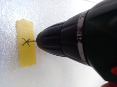 Zuerst muss man die Stelle markieren, wo man das Bohrloch bohren möchte. Dies kann man mit einem Stück Klebeband oder Malerkrepp machen. Das Klebeband verhindert ein Abrutschen des Bohrers und man kann die Bohrlochposition darauf exakt anzeichnen.